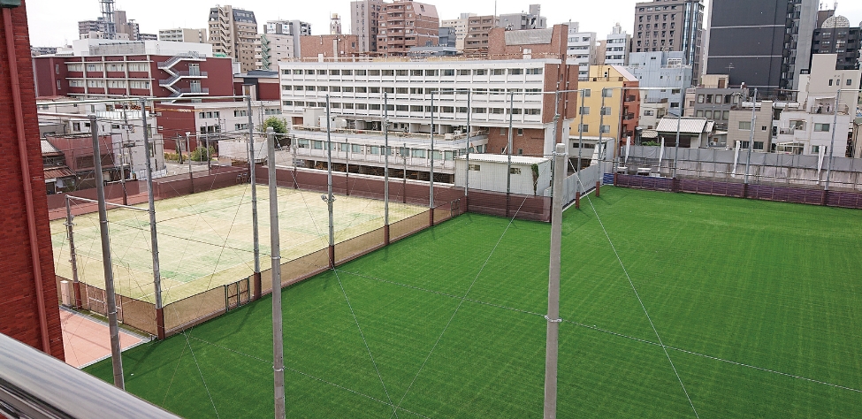 人工芝の鮮やかな緑が目を引くグラウンドと、併設のテニスコート。体育の授業はもちろん、多くのクラブ活動の場としても使用。