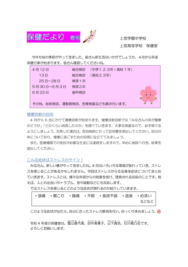 心身ともに健康で安心な学校生活を過ごしてもらうために、皆さんをサポートしていきたいと思います。