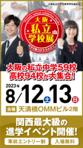 2023.07.19 中学校 入試情報 2023年8月外部説明会参加について(大阪私立学校展) 2023年8月度以下の外部説明会に参加します。 是非本校ブースにもお立ち寄りいただき遠慮なくご質問ください。 8月は大阪全ての私立学校が参加する大阪私立学校展があります。 是非学校選びのご参考にしてください、ご来場お待ちしております。 なお、事前エントリー制となっておりますので詳しくは大阪私立学校展のホームページをご覧ください。 8月12日(土)・8月13日(日) ※上限人数が決まっておりますのでお早めにお申込ください。 一覧に戻る
