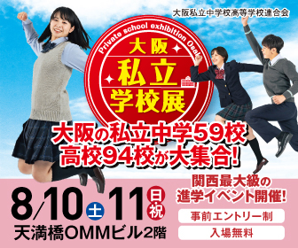 2024.07.10 中学校 入試情報 2024年8月外部説明会参加について(大阪私立学校展) 2024年8月度以下の外部説明会に参加します。 是非本校ブースにもお立ち寄りいただき遠慮なくご質問ください。 8月は多くの私立学校が参加する大阪私立学校展があります。 是非学校選びのご参考にしてください、ご来場お待ちしております。 なお、事前エントリー制となっておりますので詳しくは大阪私立学校展のホームページをご覧ください。 8月10日(土)・11日(日、祝) 一覧に戻る