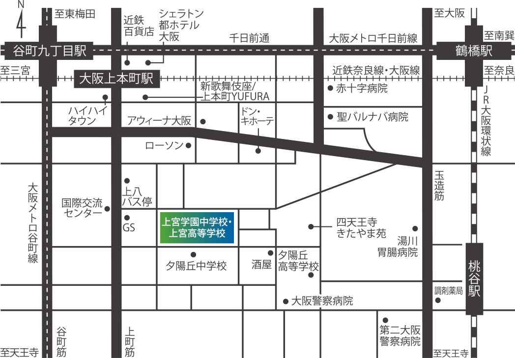 - 大阪シティバス「上本町八丁目」停留所より東へ徒歩2分
